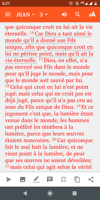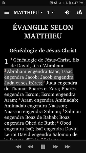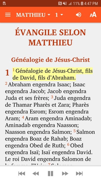 A Bíblia em áudio em francês foi integrada ao aplicativo, para que você possa ouvir o áudio quando quiser. Você pode começar a ouvir em qualquer lugar dentro de um capítulo tocando no versículo que deseja ouvir.